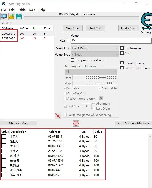 ①:当与女主第一次H时 CE不用搜索0 进程会崩 从第一个涨好感3/5的时候开始搜就行 大概三次就会好 这时候你有两个选项 【0D】【22/23】开头的 选0D那个就可以 然后改到100