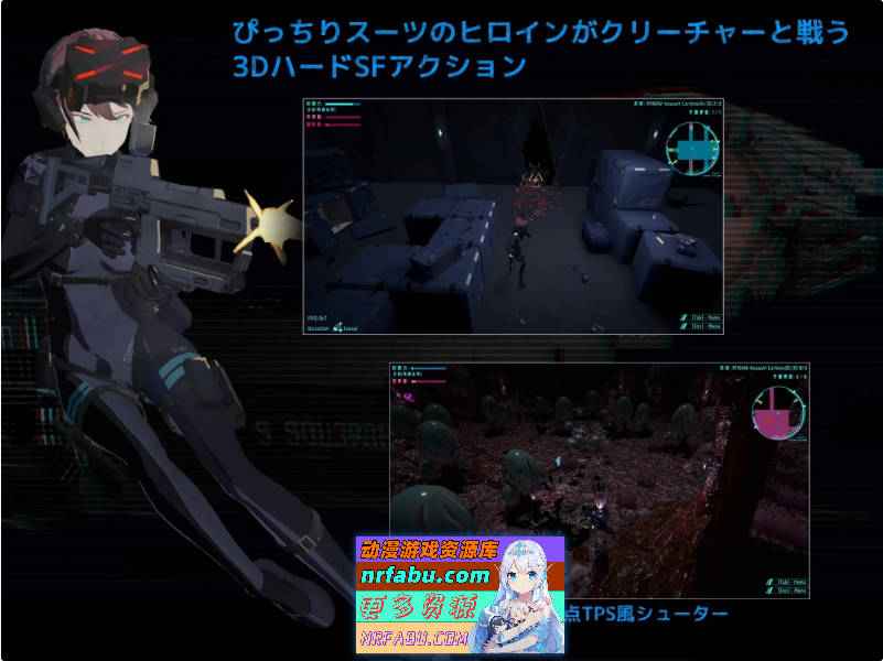 一款俯视角科幻射击/动作游戏,主角为身着紧身作战服与战术背带的女英雄。